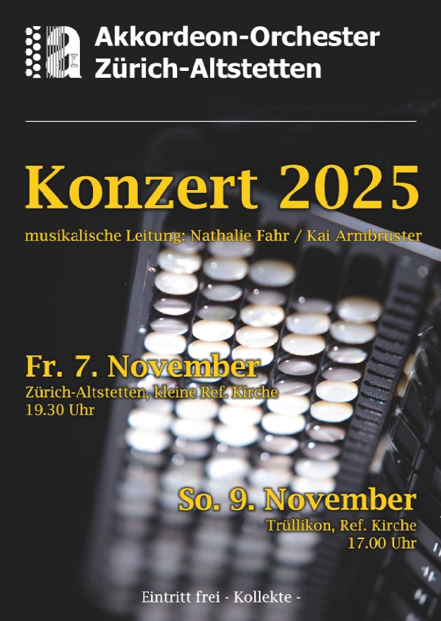 Am Sonntag, den 2. November 2025, ist es wieder so weit! Das Akkordeon-Orchester Wil lädt Sie herzlich zu seinem Jahreskonzert ins Pfarreiheim Bronschhofen ein. Unter der inspirierenden Leitung von Anita Felix hat das Orchester ein abwechslungsreiches und mitreissendes Programm einstudiert. Daniel Felix wird uns mit spannenden Anekdoten und Informationen zu den einzelnen Stücken durch den Abend begleiten. Der Eintritt ist frei, wir bitten jedoch um eine Kollekte zur Deckung der Unkosten. Im Anschluss an das Konzert laden wir Sie herzlich zu einem kleinen Apéro im Foyer ein. Wir freuen uns sehr auf Ihren Besuch und einen unvergesslichen Abend voller Musik!
