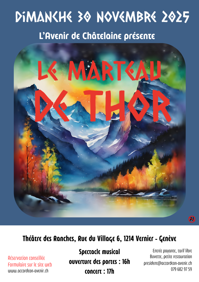 Cet automne, l'Avenir de Châtelaine quitte les chaleurs estivales pour vous emmener dans le Grand Nord... ❄ Au programme, une revisite de la mythologie nordique, sur fond d'aurores boréales, de banquises et de rencontres incongrues... 💌 Alors, enfilez vos moufles, vos bonnets et vos grosses bottes fourrées, car ce n'est pas à la chasse au phoque qu'on vous emmène, mais directement au pays du des possibles, au point le plus frisquet de notre planète! 🧊🥶 Attention! Cette année, l'Avenir de Châtelaine se produira le dimanche en fin de journée et non pas le samedi soir. 💢💥 __________________________________________ Informations pratiques : DIMANCHE 30 novembre 2025 📆 Ouverture des portes : 16h ⏲ Concert : 17h 🎵 Tarif : entrée libre, chapeau à la sortie 💰 Petite restauration & buvette sur place 🥂 Réservations : https://framaforms.org/le-marteau-de-thor-reservation... _____________________________________________________ Accès : TPG : bus 6, 19, 53, 57 - Vernier - Ecole 🚌 Vélo : parking à vélo 🚲 Voiture : places bleues dans le quartier 🚃
