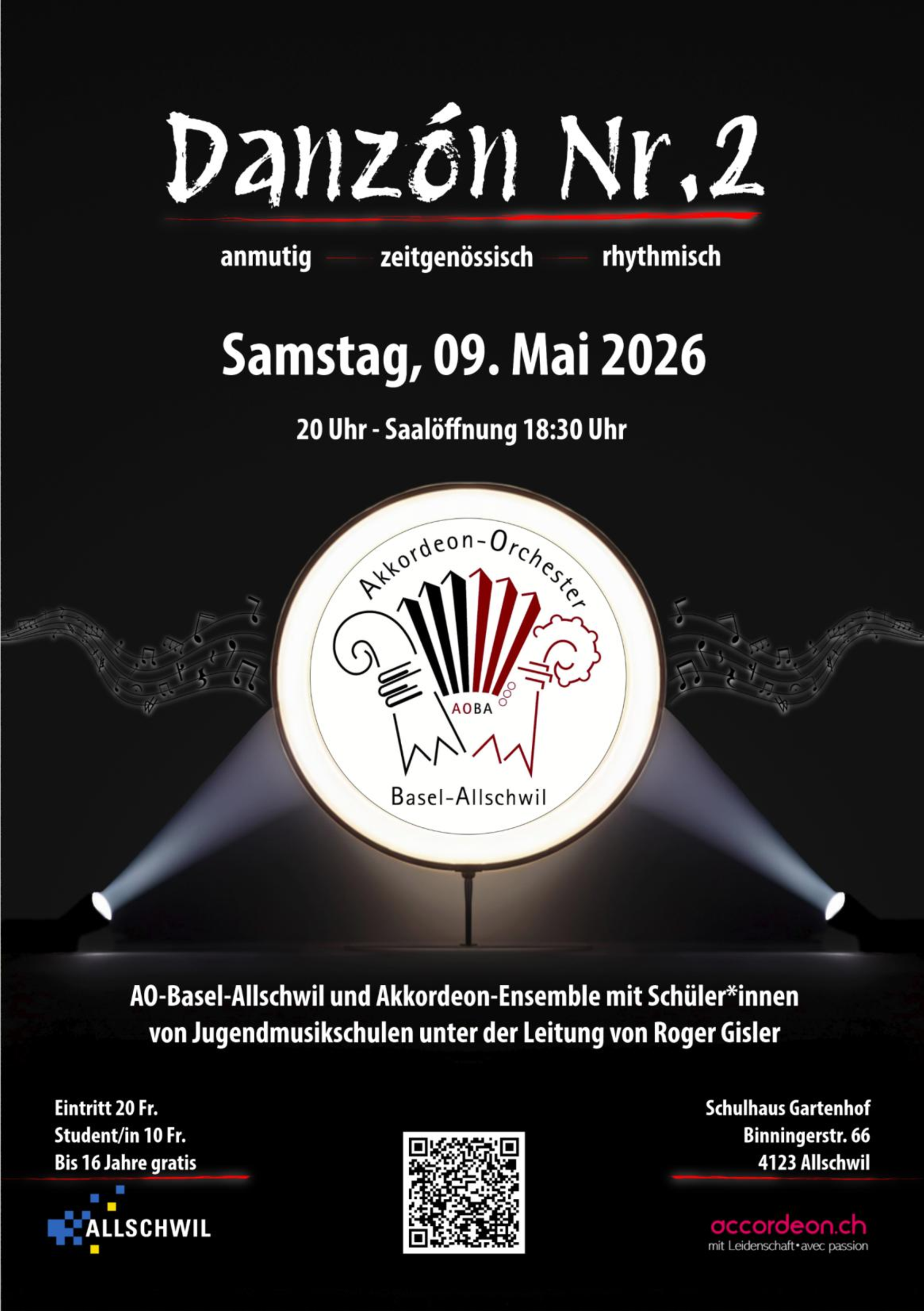 "Danzón Nr.2 - anmutig, zeitgenössisch, rhythmisch" unter diesem Motto steht das Jahreskonzert des AO Basel-Allschwil vom 9. Mai 2026 in der Aula Gartenhof Allschwil. Auch in diesem Jahr präsentiert das AOBA ein vielseitiges Programm aus Werken verschiedenster (Tanz-)Musikrichtungen. Mit der Gastformation, einem Projektorchester aus Schülerinnen und Schülern von Dirigent Roger Gisler bietet das AOBA im zweiten Konzertteil der Jugend und Nachwuchsförderung eine Bühne. Das Konzert beginnt um 20:00 Uhr. Saalöffnung ist bereits um 18:30, dann wird ein Abendessen angeboten. Der Eintrittspreis beträgt CHF 20.-, für Auszubildende/ Studierende CHF 10.- und für Unter-16-Jährige ist der Eintritt gratis. Gerne reserviert das AOBA Ihnen einen Platz. Melden Sie sich dazu am besten mit der gewünschten Anzahl zu reservierender Plätze an info@aobasel-allschwil.ch oder direkt an eine AOBA-Mitglied. Lassen Sie sich begeistern. Das AOBA freut sich über Ihren Konzertbesuch!