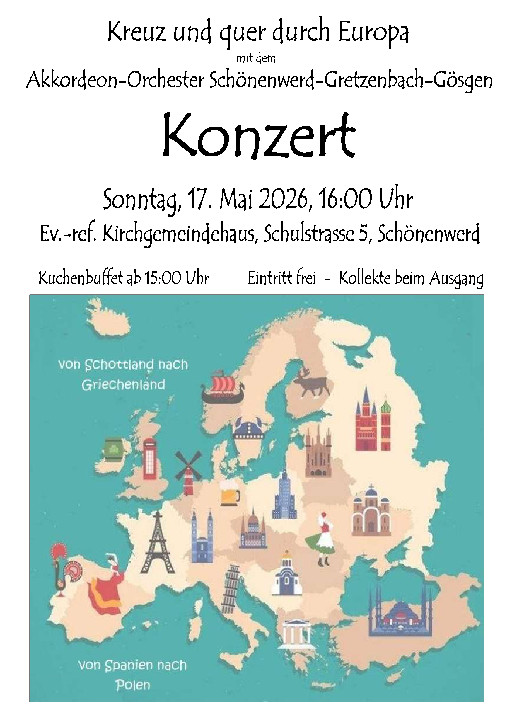 Wir laden Sie auf eine musikalische Reise "Kreuz und Quer durch Europa" ein. Unter der Leitung von Max Wyss begleitet Sie das AO Schönenwerd-Gretzenbach-Gösgen mit vielen bekannten Melodien. Für die "süsse" Begleitung sorgt das Kuchenbuffet ab 15.00 Uhr. Wir freuen uns auf Ihren Besuch.