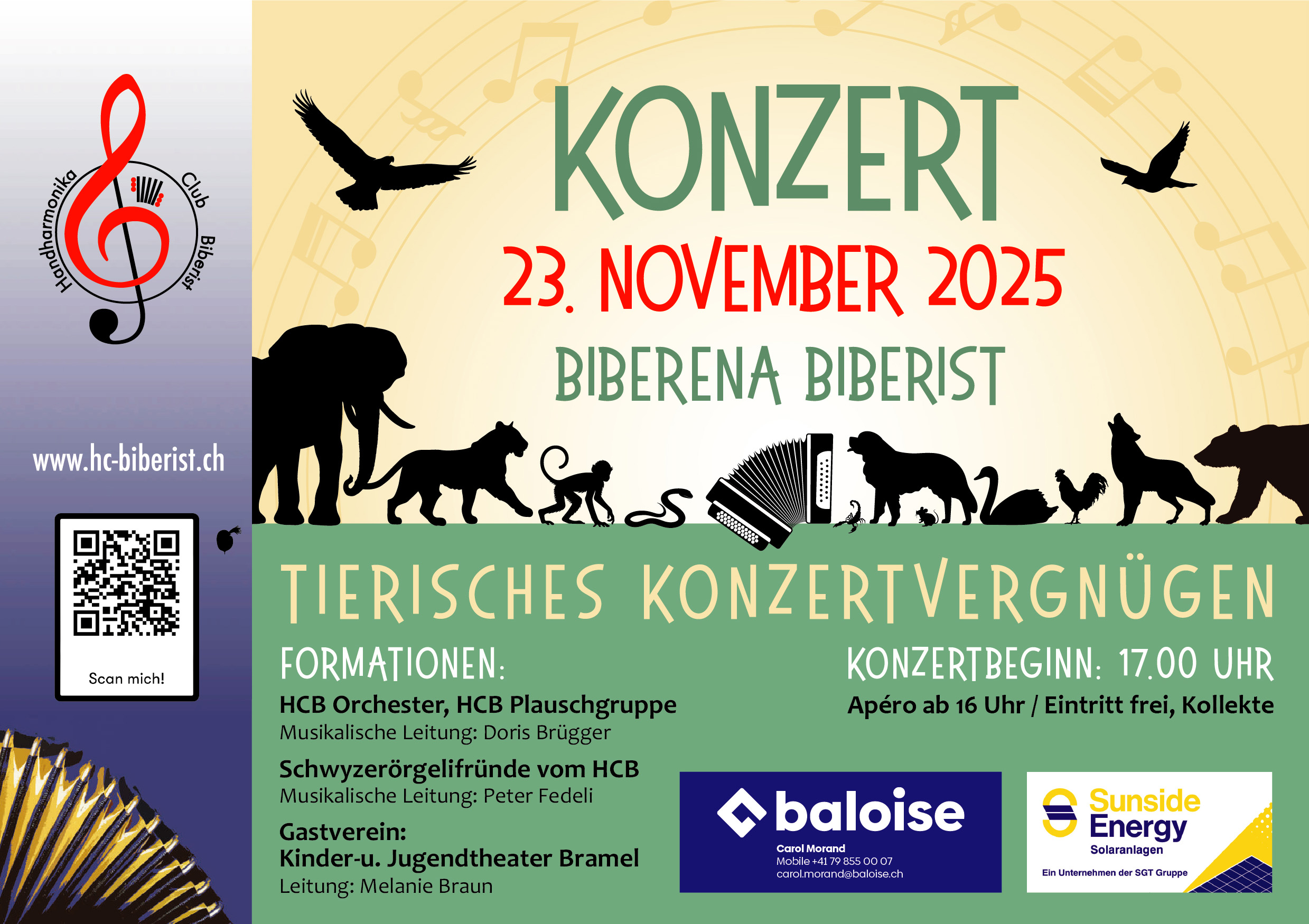 Wir laden Sie ein zu einem "TIERISCHEN KONZERTVERGNÜGEN". Musikalische Leitung Orchester und die Plauschgruppe: Doris Brügger Musikalische Leitung Schwyzerörgelifründe vom HCB: Peter Fedeli Gastverein: Kinder- und Jugendtheater BRAMEL: Leitung Melanie Braun