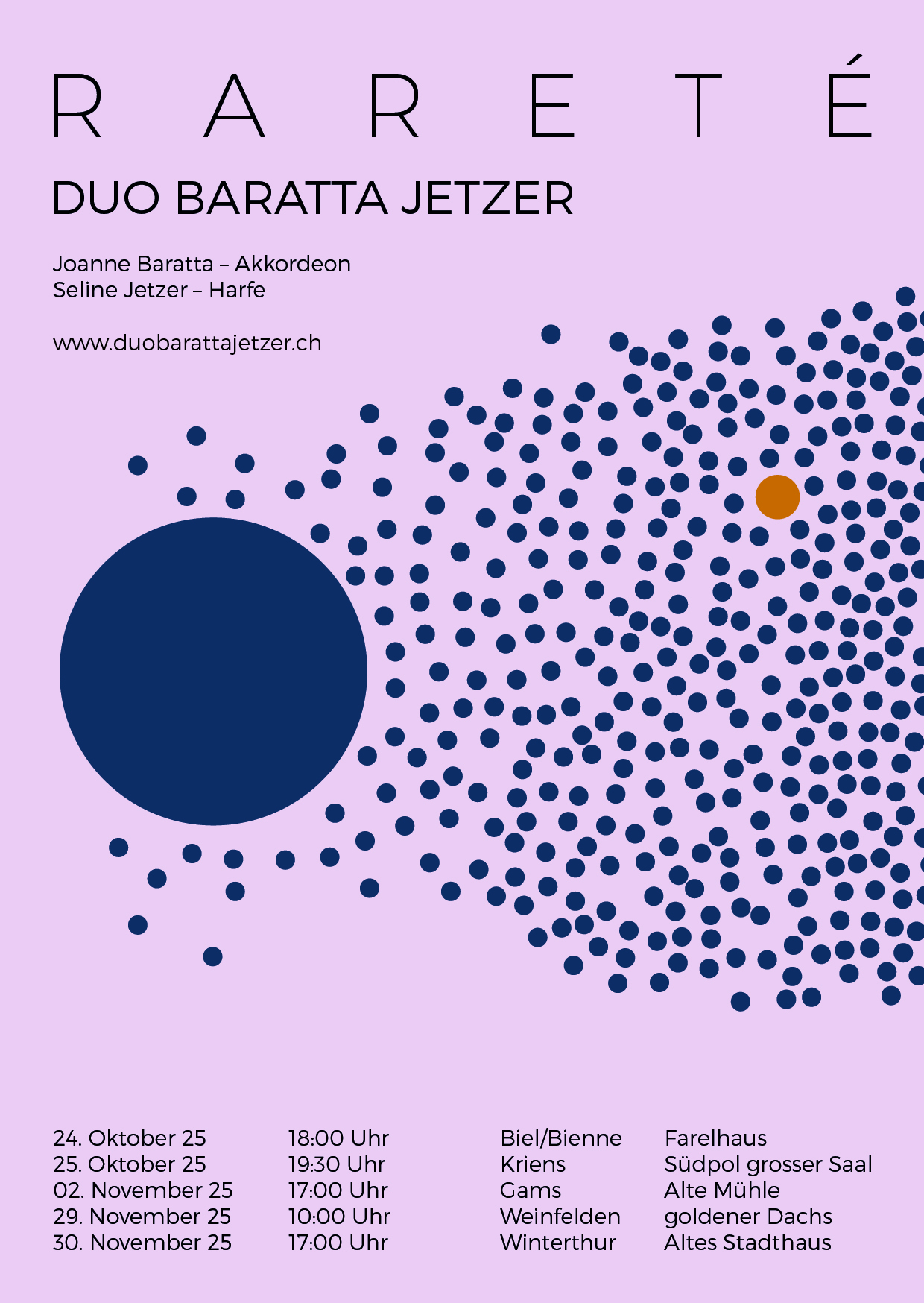 Mit «RARETÉ» erschafft das DUO BARATTA JETZER einen Klangraum, in dem das Ungehörte zum Klingen gebracht wird. Seltene, vergessene und unentdeckte Werke treten aus dem Schatten ins Licht und entfalten ihre eigene Ausdruckskraft. mit Werken von Amy Marcy Beach (1867-1944), Valérie Secretan (*1954), Gaspard Le Roux (1670 - 1707), Mélanie Hélène Bonis (1858-1937), Anne-Louise Brillon de Jouy und einer Auftragskomposition von Maxime Rayer (*2001). Ticket Vorverkauf auf duobarattajetzer.ch