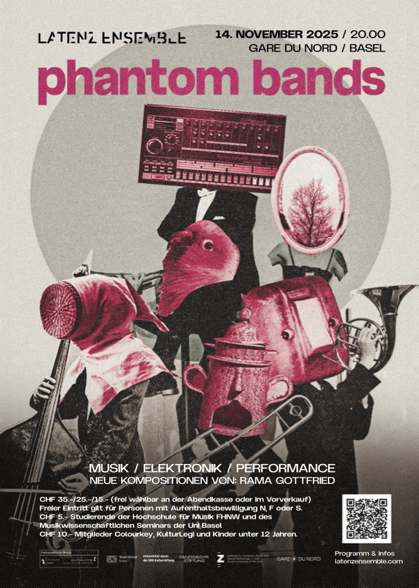 Rama Gottfried schliesst sich mit latenz ensemble in «phantom bands» zusammen und zaubert neue, nicht-menschliche Musiktheater-Ökosysteme, die von Kreaturen bewohnt sind, die in vage punkigen und fliessend raffinierten technischen Subkulturen auftauchen und auftreten. Teils Objekttheater, teils Live-Kino, verwandelt sich das Ensemble ständig - physisch und klanglich - und verkörpert Wesen, die mit hybriden digital-akustischen Stimmen sprechen. Eine Vielzahl von Klängen, Puppenspielen, Videos und instrumentalen Materialien verweben mehrere von Gottfrieds animistisch-ökologischen Stücken: das Computer-Vision-Puppenspiel «Scenes from the Plastisphere», live-foley Ausschnitte aus «Ontopoiesis» und die Premiere von «phantom bands», komponiert für latenz ensemble. Die Performance ist eine experimentelle Methode der nichtmenschlichen Charakterbeziehung, bei der das Publikum in eine neue Gesellschaft mit anderen Lebensformen, Kontexten und Umgebungen eintritt, die sich endlos in neue Möglichkeiten der Form und Erfahrung entfalten. latenz ensemble sind Benjamin Coyte, Daniil Gorokhov, Elijah Spies, Hannah Wirnsperger, Laura Mehmeti, Maria Munoz Lopez, Mikael Szafirowski, Mikolaj Rytowski and Paula Häni Rama Gottfried, Komposition und Regie Anna Paniccia, Kostüme und Puppen Rosa Wernecke, Licht https://www.latenzensemble.com/