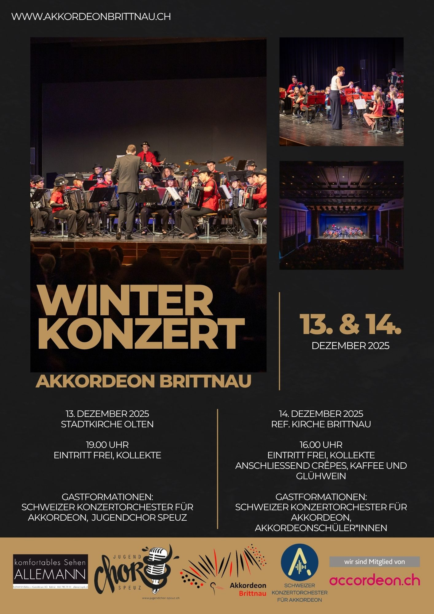 Winterkonzert in der Reformierten Kirche Brittnau mit Akkordeon Brittnau. Gastformationen: Akkordeonschüler*innen und das neu gegründete Schweizer Konzert Orchester für Akkordeon Nach dem Konzert Crêpes Kaffee und Glühwein im Kirchengemeindehaus www.akkordeonbrittnau.ch