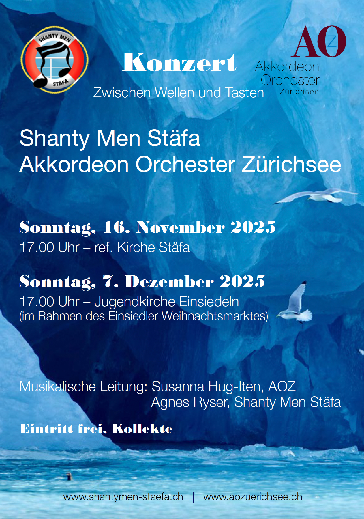 Zwischen Wellen und Tasten - Shanty Men Stäfa & Akkordeon Orchester Zürichsee Musikalische Leitung: Susanna Hug-Iten, AOZ Agnes Ryser, Shanty Men Stäfa Eintritt frei, Kollekte www.shantymen-staefa.ch | www.aozuerichsee.ch