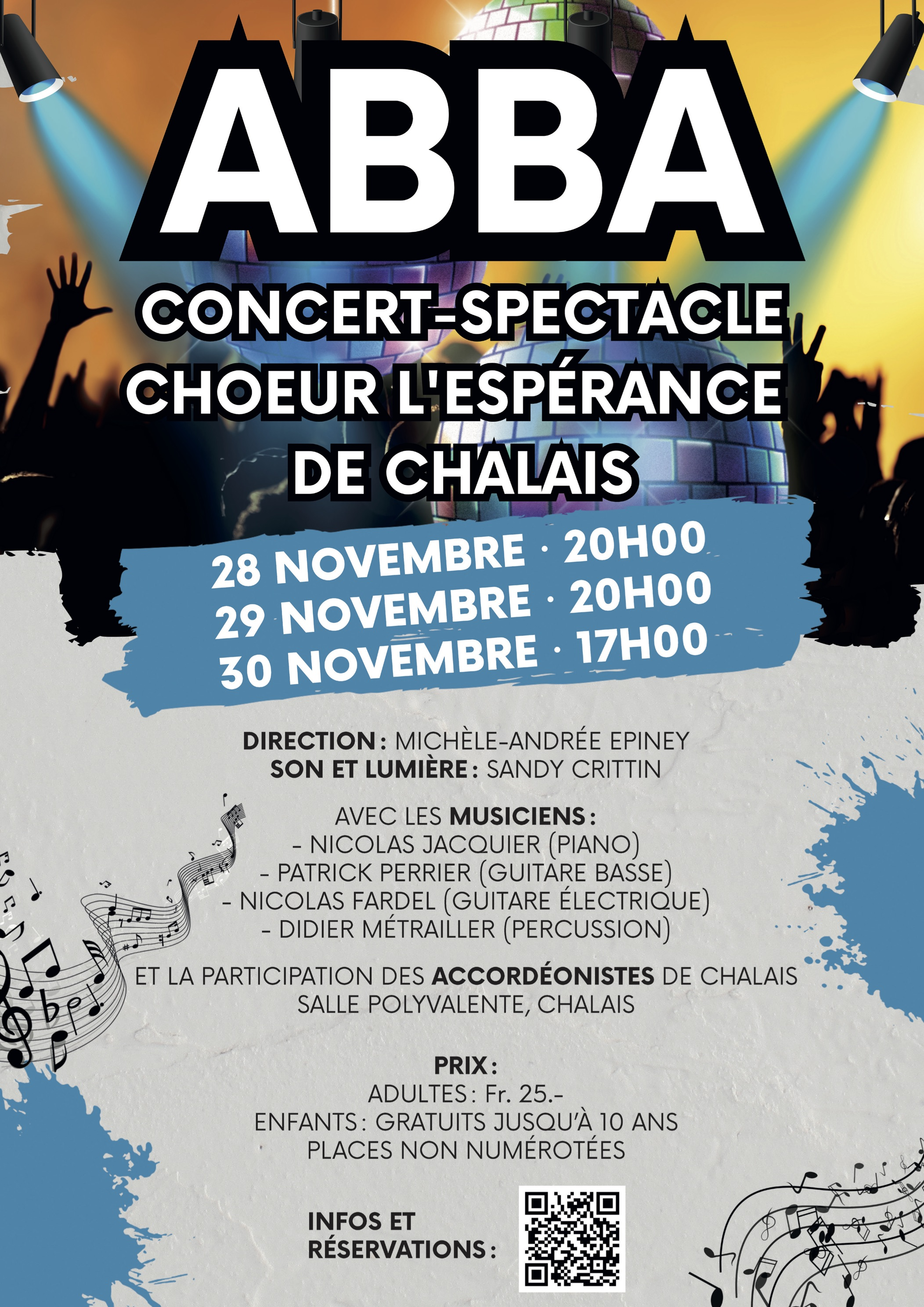 Venez nombreux au concert-spectacle du choeur l'Espérance de Chalais ! Au programme, une sélection des plus grands succès du célèbre groupe ABBA. Vous serez transportés par une mise en scène éblouissante où les jeux de lumière créeront une atmosphère magique et festive tout au long de la soirée. L'accompagnement musical est assuré par des musiciens professionnels et l'Amicale des accordéonistes. Mise en scène et direction: Michèle-Andrée Epiney Le samedi soir, soirée disco dès 21h30. Restauration 2 heures avant le spectacle. Adultes Fr. 25.-- / Enfants jusqu'à 10 ans gratuits Réservations par Code QR ou : https://infomaniak.events/fr-ch/shop/choeur-mixte-lesperance-de-chalais-QWQ5S6HM9W